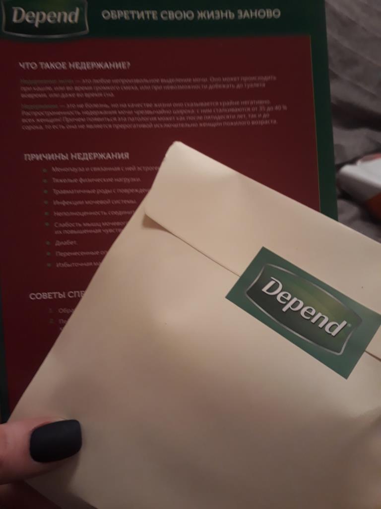 Плотная упаковка, которая позволяет носить в сумочке одну прокладку про запас. Бархатистая поверхность прокладки не натирает кожу, нет чувства опрелости от длительного ношения. Хорошие впитывающие свойства. Не заметна под одеждой, включая брюки. Удобна и комфортна в использовании. С урологическими прокладками Depend нет шанса оконфузится в обществе! С Depend каждая женщина может быть уверенной в себе! Рекомендую женщина, имеющим деликатные проблемы.