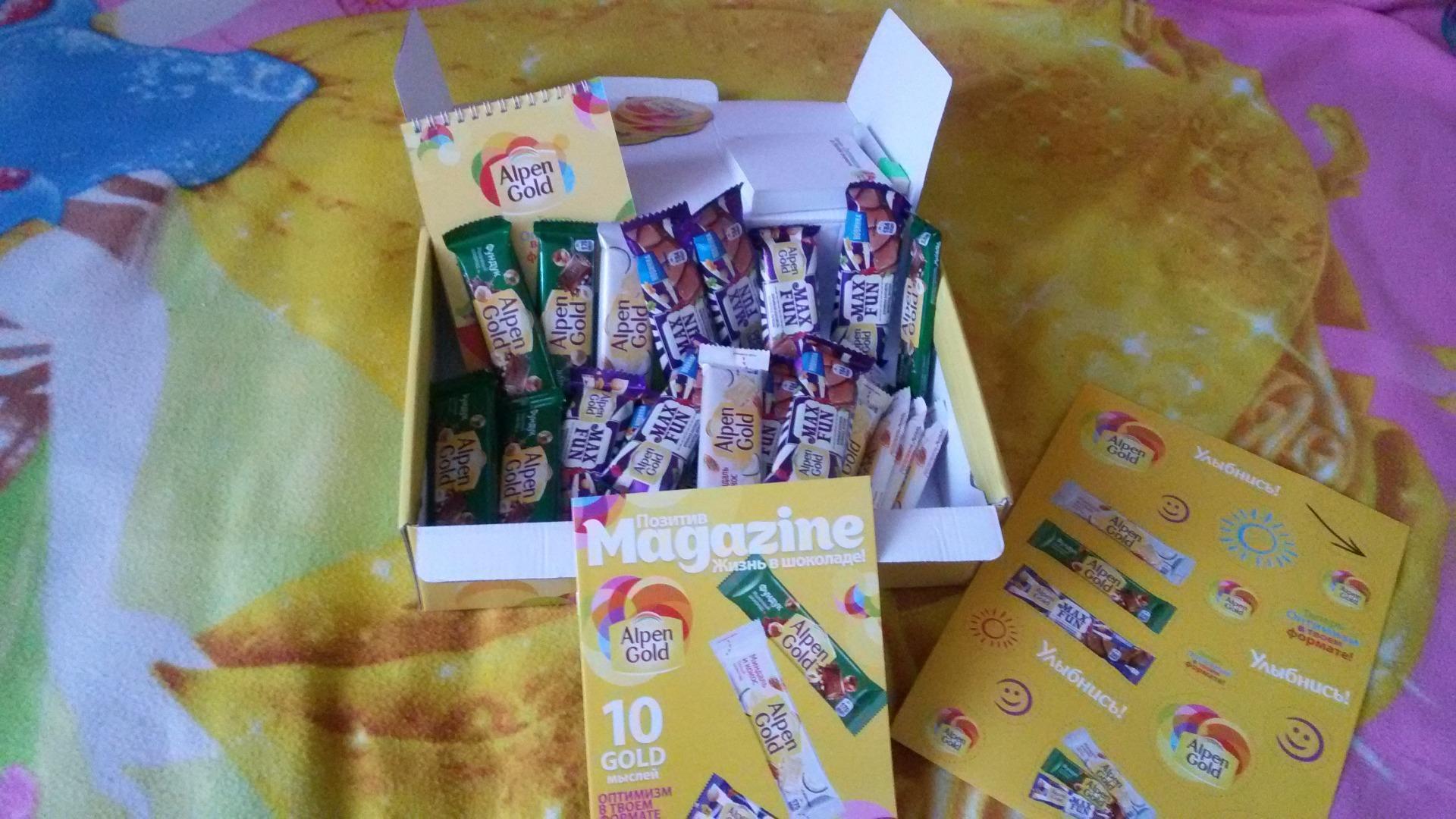 Новый формат шоколадок очень удобен! Alpen Gold молочный с фундуком, белый шоколад с миндалем и кокосом, Max fan- взрывная карамель, мармелад, печенье!Три разных вкуса и все такие вкусные! Легко открываются не пачкая руки, одного батончика хватае как раз на одно чаепитие! Каждый друг и колеега нашли себе шоколадку по вкусу. Так же были подарочки для агента, стикеры для записей, маркер, календарь и магниты. Дети теперь рисуют на хольдильнике все что захотят))) Всем советую Альпен гольд, супер шоколад!