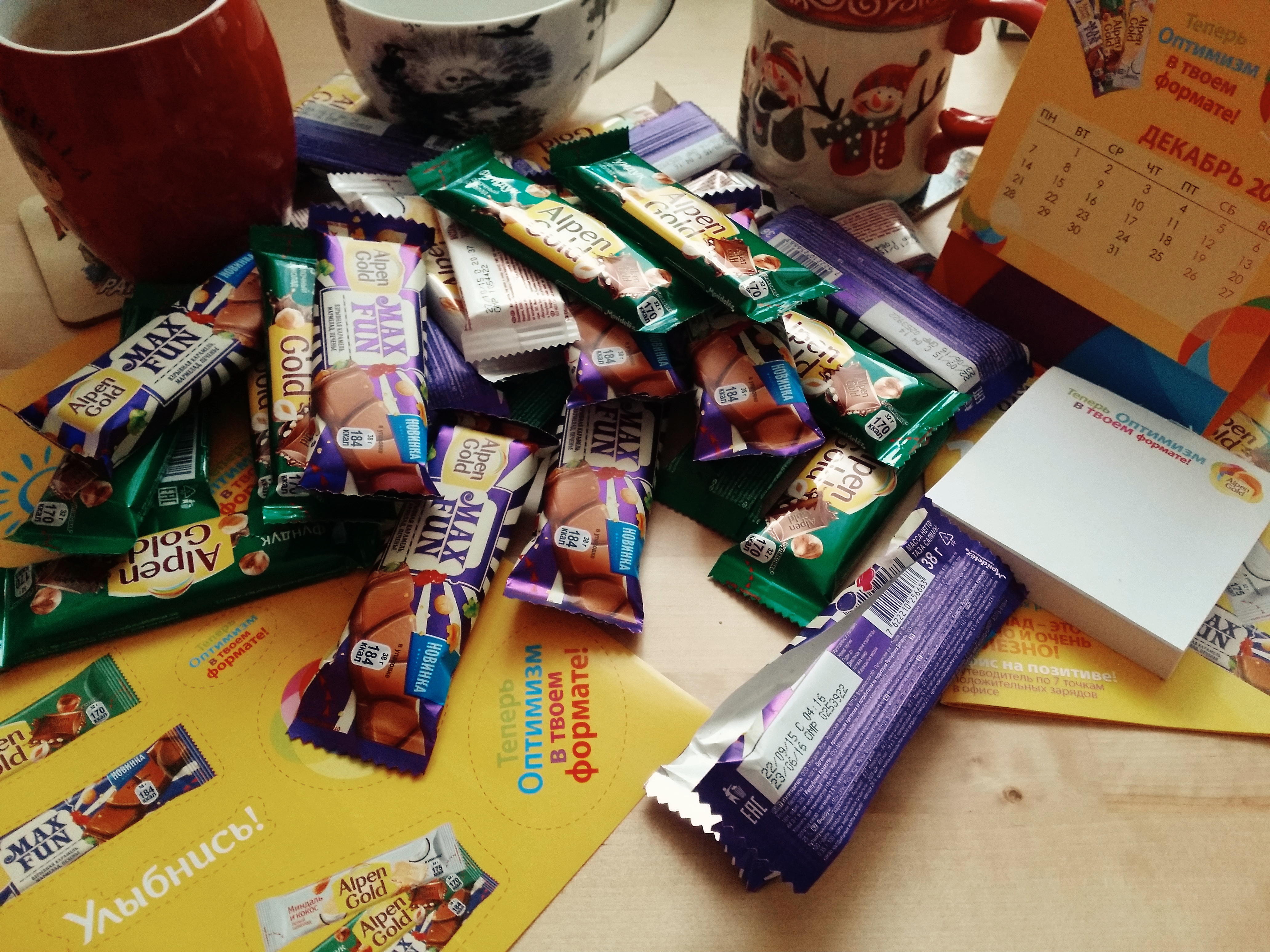 Мне из трех видов больше всего понравился Max Fun (все три вкусные, конечно, но этот больше всего), неожиданно во рту что-то начало потрескивать смешно и не сразу понятно откуда эта опция появилась - вот этот шоколад теперь мой фаворит. Вообще, разлетелись шоколадки в момент, поесть-то наши товарищи сладенькое всегда горазды, тем более в понедельник утром, а уж тем более, что всё это бесплатно:) На мой взгляд, открывать на ходу не особо удобно, но это ерунда - главное есть на ходу удобно и сладко, белый шоколад даже очень сладко, его лучше с чаем. А еще, спасибо за календарь настольный!