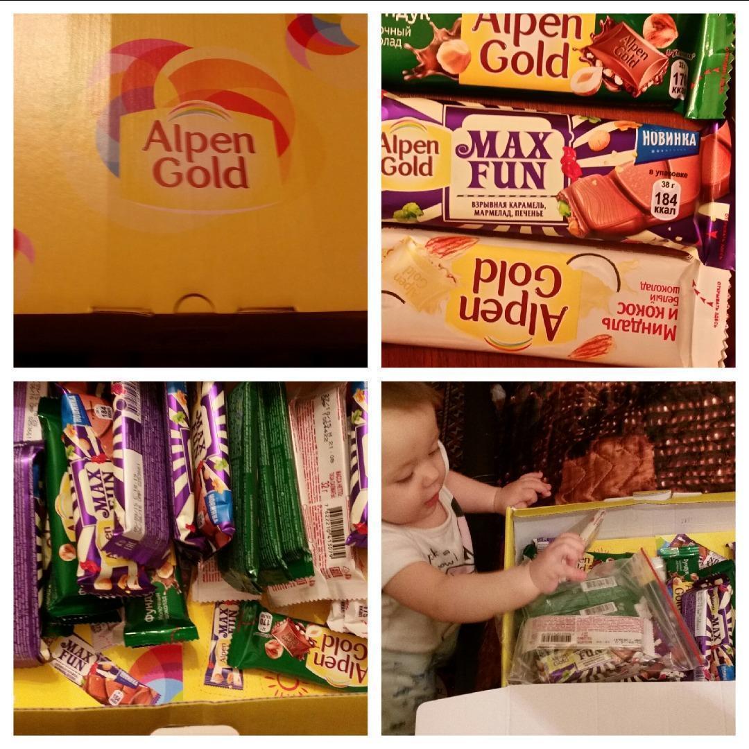 Шоколад очень вкусный, приятный на вкус. упаковка удобная практичная руки не пачкаются, не надо делится все по честному. Весьма необычный вкус Max Fun, мне в нем не понравилось то, что мармелад целиком попался, как то долго жуется. а в целом вкусно. Взрывная карамель прикольная, как в детсвтве шипучка взрывается, забавно. Шоколад так и хочет есть и непереставать пить чай с ним. Миндаль и кокос приятный на вкус, обычно мне не нравился белый шоколад но правильное подобранное сочетание делает его неповторимым белым шоколадом, если есть белый шоколад, то только Алпен гольд
