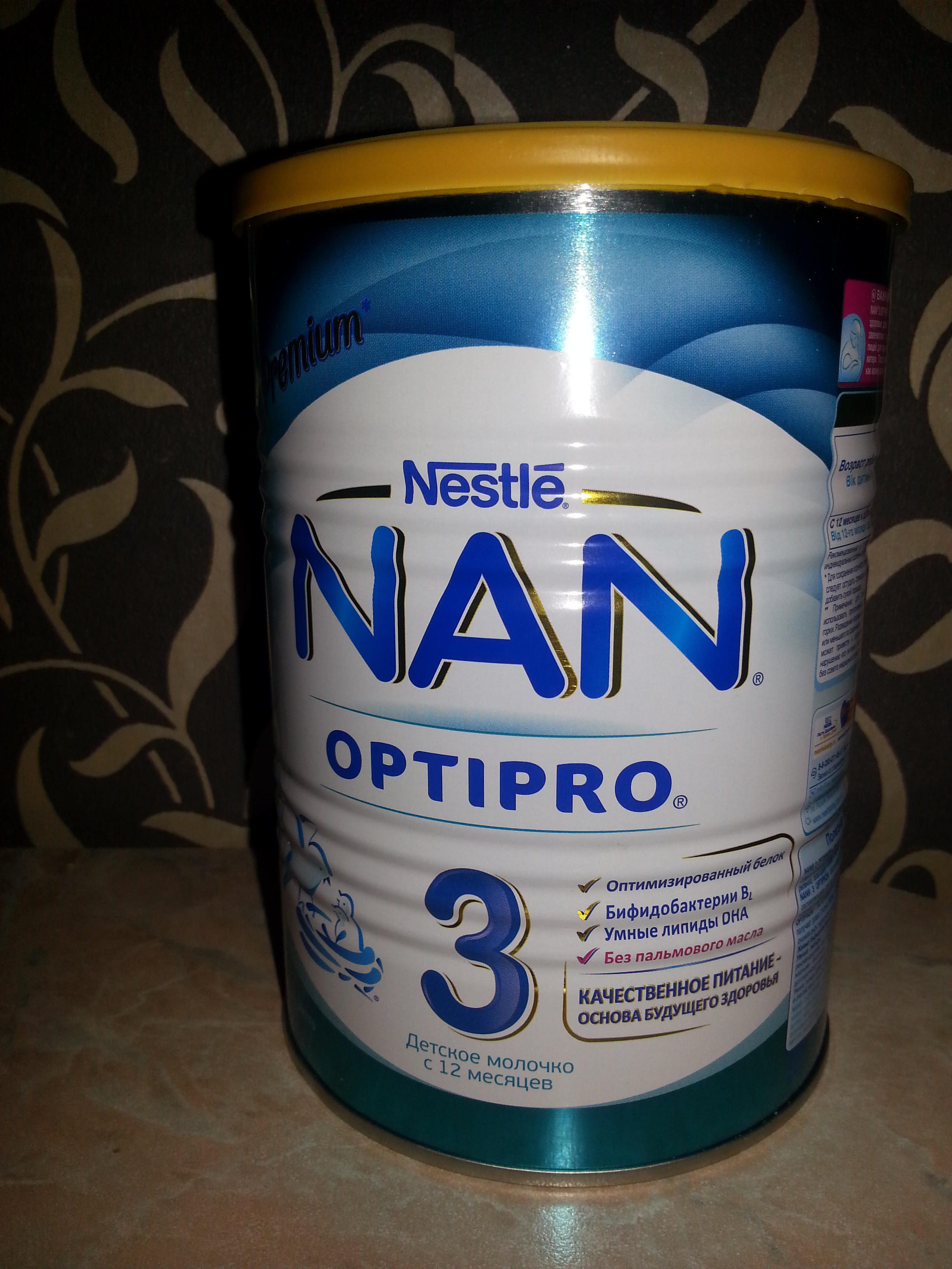 Детское молочко NAN OPTIPRO 3 предназначена для деток старше 12 месяцев. Сама смесь молочно-белого. Рассыпчатая. Есть удобная мерная ложечка, которая при покупке лежит на фольгированном слое, а не в самой банке, что крайне не удобно в других смесях. Сама банка герметично закрыта, под крышкой фольгированный слой, который не позволяет проникать пыли под крышку, что на мой взгляд очень хорошо и удобно при транспортировке. Большой плюс NAN OPTIPRO 3 для меня его состав: нет пальмового масла, она содержит все необходимые витамины и минералы по возрасту ребенка, содержит полезные бифидобактерии и умные липиды DHA. Смесь без труда растворяется в бутылочке и она очень просто готовится. Ложечка удобно располагается и не падает в банку.Аллергии и срыва стула не было.Буду рекомендовать эту смесь знакомым в качестве дополнения к основному рациону ребенка.