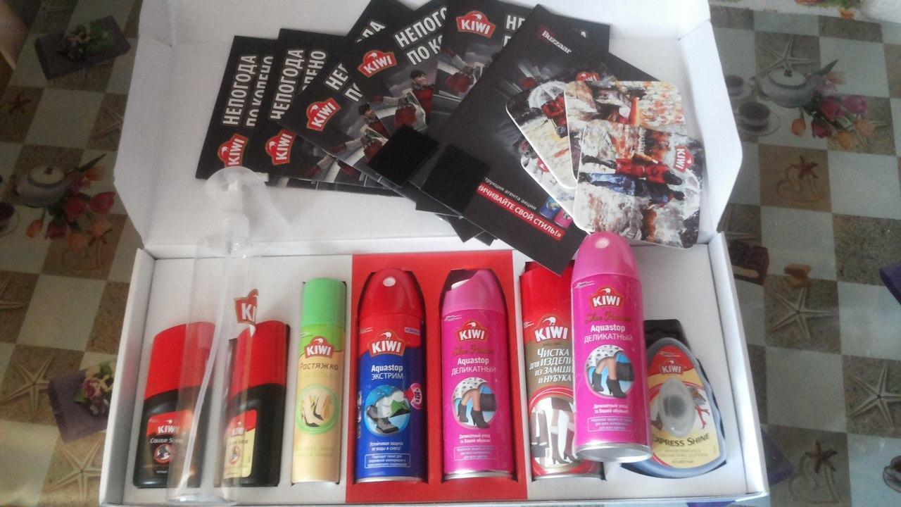 Набор "Kiwi" - первый подарок от баззар, очень порадовало разнообразие продукции. А самое главное, что он пришелся на ту погоду, когда слякоть и постоянно промокает обувь. Но после тестирования продукции Kiwi Aquastop , я поняла, что непогода не страшна моей обуви и обуви моих знакомых и коллег.
