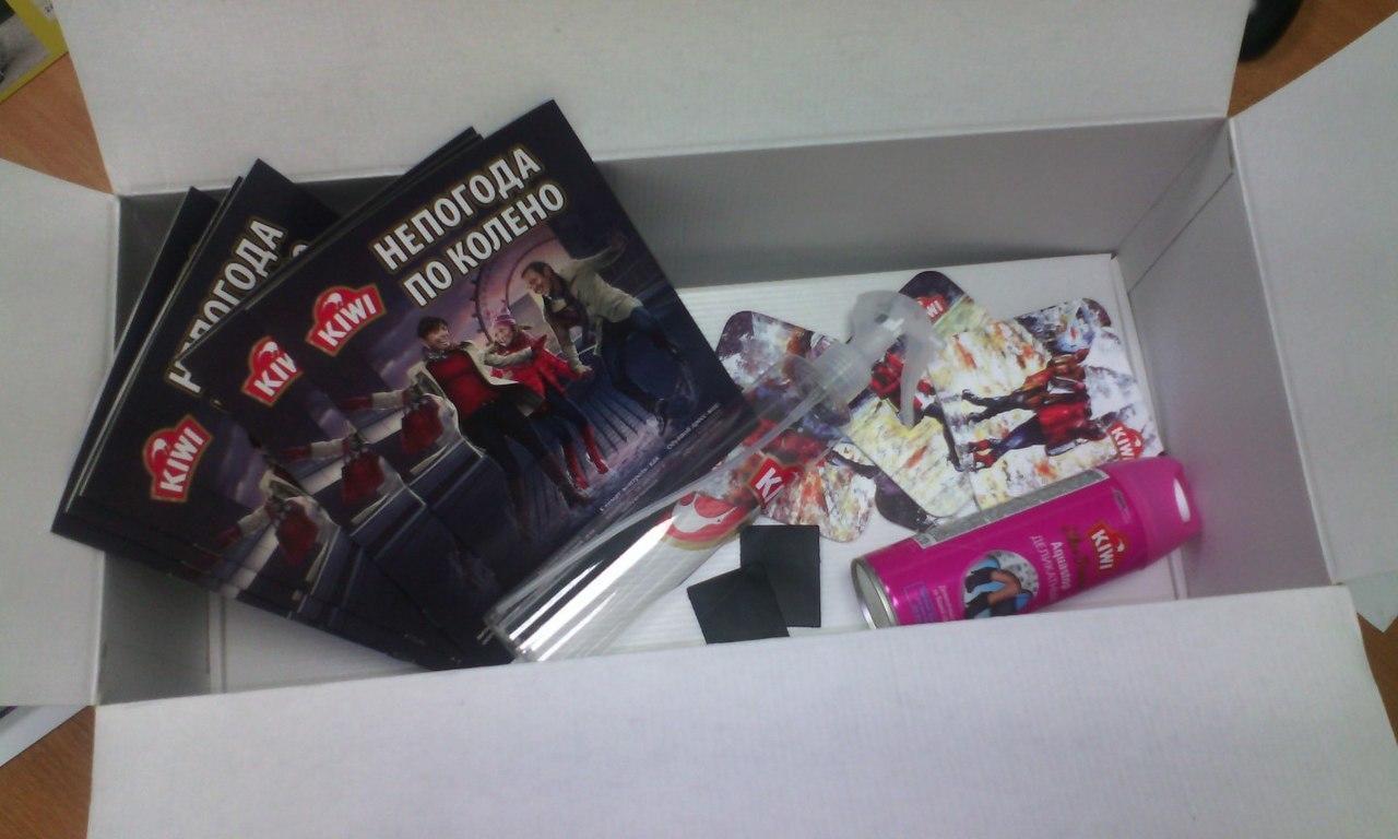 К сожалению, посылку KIWI доставили, когда на улице уже лежал снег, поэтому в дождливую погоду и слякоть протестировать не получилось... Но тем не менее в офисе мы с удовольствием опробовали всю коробку. Чистка для изделий из замши и нубука, Жидкий крем-блеск, а также Аквастоп пользовались наибольшей популярностью.
