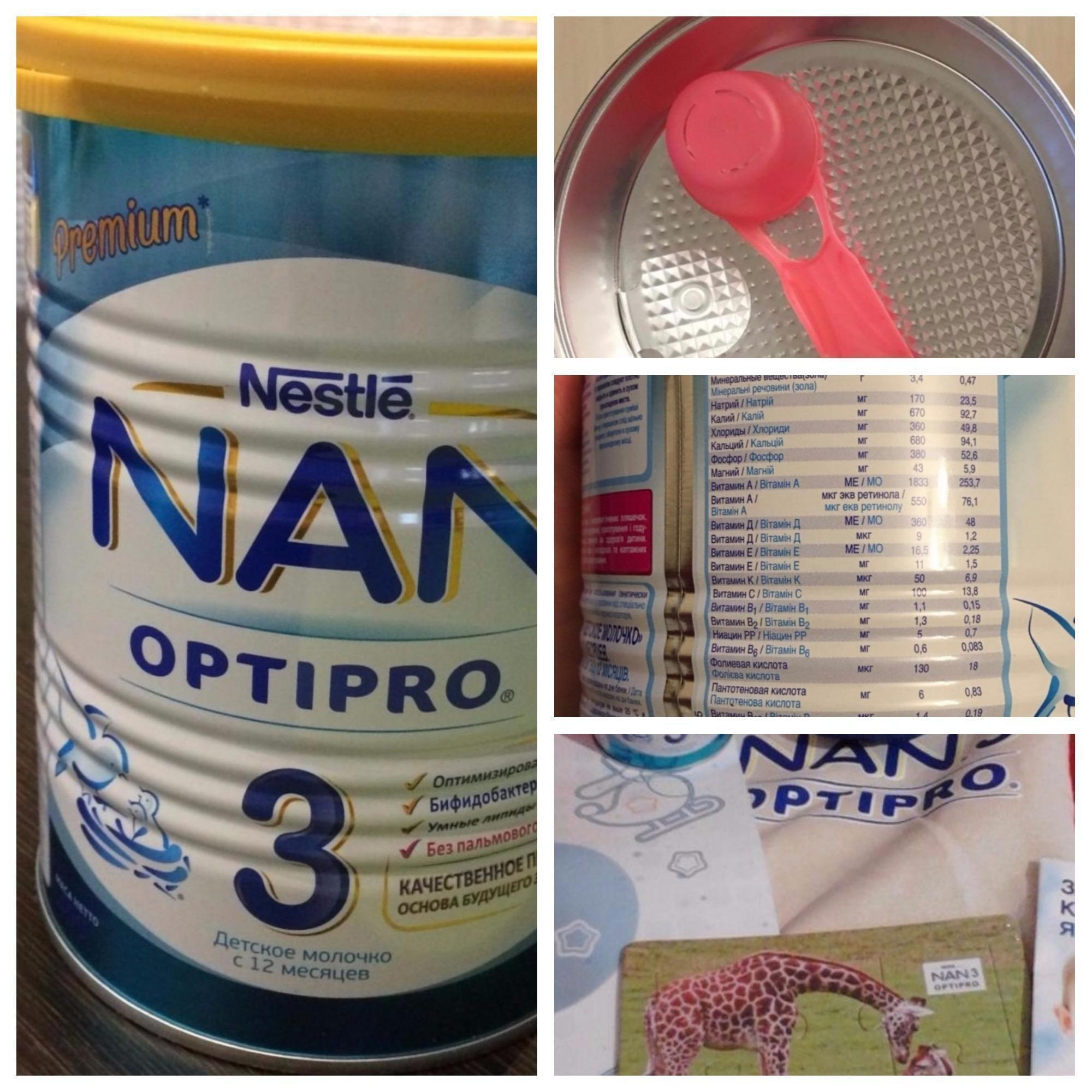 Приготовив для кормления порцию, я подождала до следующего дня. Аллергии у ребенка не было. Вкус ребенку понравился. Проблем с животиком не было. Молочко очень хорошо усваивается ребенком. Упаковка удобная для открытия и пользования. На крышке банки имеется плотный клапан, позволяющий понять, что банка новая. Мерная ложечка розового цвета лежит отдельно от смеси, вверху под крышечкой, в отдельном пространстве. Все закрыто герметично. Разводится смесь при температуре +37 градусов. Сама смесь немного желтая, а молочко получается белым, и со сладким вкусом. Комочки не образуются при разведении. NAN 3 Optipro оправдало мои ожидания и надежды на полноценное питание для моего малыша. Данная смесь не содержит пальмового масла, в составе оптимизированный адаптированный белок для роста и развития, а также аминокислоты, омега-3 жирные кислоты, микроэлементы и бифидобактерии для иммунитета. Как для мамы, чрезвычайно важно знать, что в составе всё полезное. И кормить качественным полноценным питанием своего ребенка. Другим мамам также советую NAN 3 Optipro! Сама тоже буду пить!!!