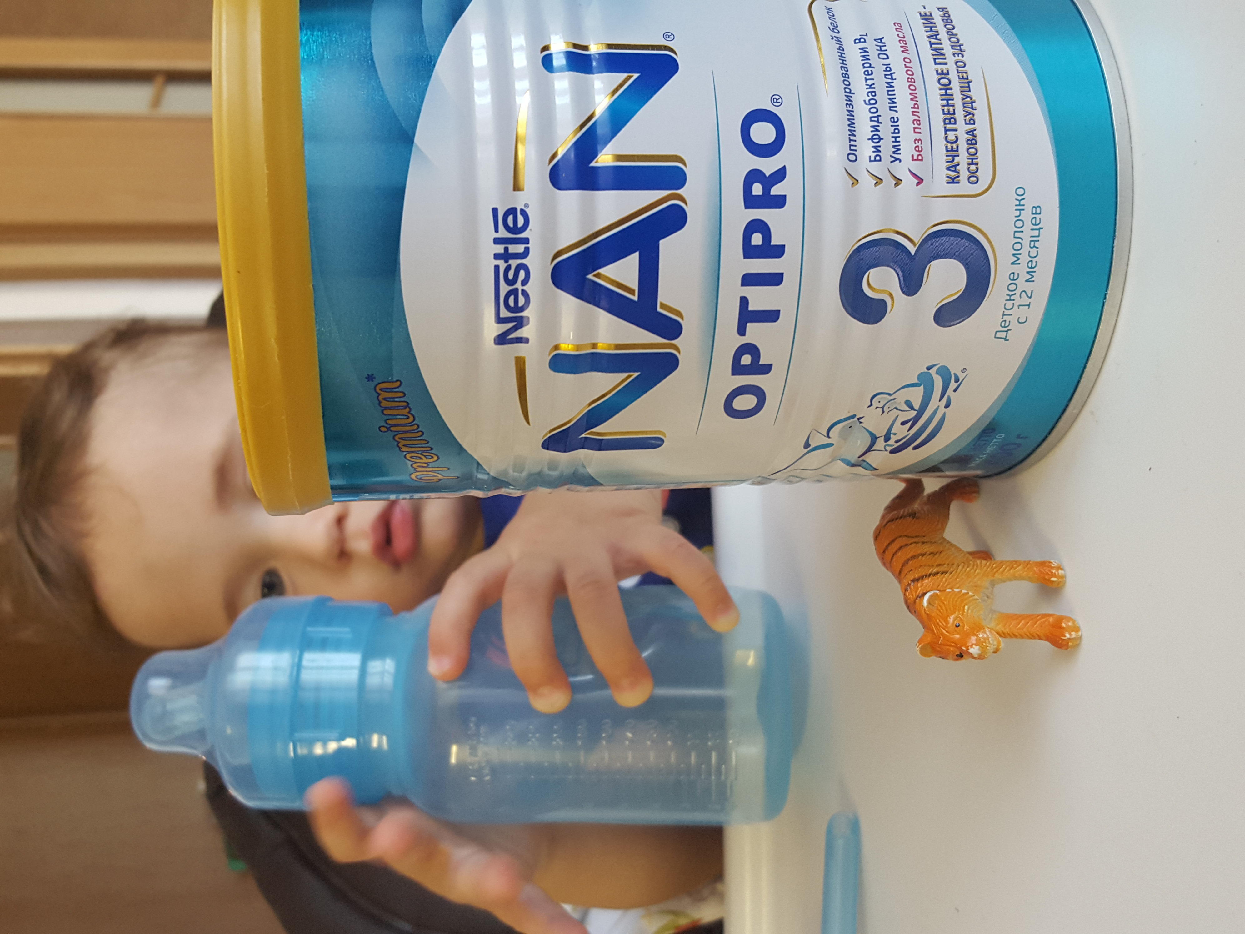 Моему сыночку уже 1,5 года. До 1,2 он получал грудное молочко и кисломолочную смесь NAN, т.к. на молочную смесь другого производителя у него была аллергия. Но т.к. время идет и надо потихоньку переходить на общий стол и соответственно на молоко, то решили попробовать NAN® 3 OPTIPRO®. Взяли троечку, т.к. наш возраст попадает в диапазон от года до полутора лет. Очень хорошо, что есть такое разделение и каждому возрасту выделяются самые необходимые витамины и нужные для данного периода роста вещества. В данной смеси нет пальмового масла, что тоже немаловажно. Так же в данной смеси NAN® 3 OPTIPRO® содержится адаптированный белок OPTIPRO® для гармоничного роста и развития малыша. Молочко упакованно в жестяную банку с мерной ложечкой. Это намного лучше, чем картонная коробка. Молочко хорошо растворяется. Мы доверяем данному проищводителю, т.к. на их смеси растет уже третий ребенок нашей семьи. И еще двое деток сестры