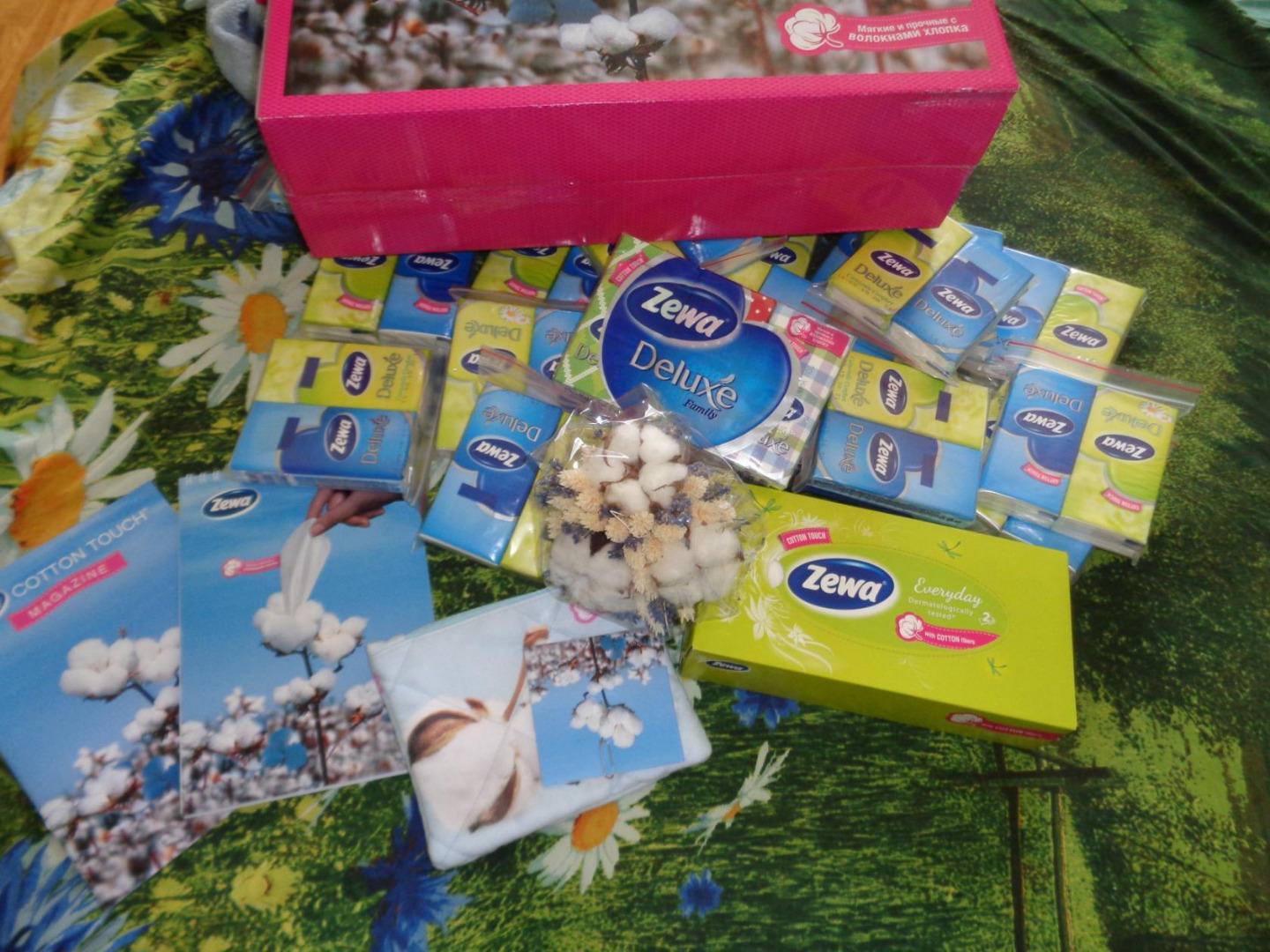 Добрый день! Хочу поделиться радостью, сегодня нам доставили Буз-кит с наборчиком от Зева. Приятно удивило количество мини наборчиков для друзей). В наборе было: косметичка(дочка сразу у тащила ее играть), букетик саше(постигла таже участь), блокнот оч красивой наружности, упаковочка платочков для личного пользования, коробочка-дозатор салфеток и много много упаковочек с платочками для друзей и подруг). Хочу сразу отметить аромат исходящий от коробочки. Кстатит оч вовремя доставили посылочку, т.к. вся семья у нас немного приболела( теперь есть мягкие и нежные платочки для наших носиков!