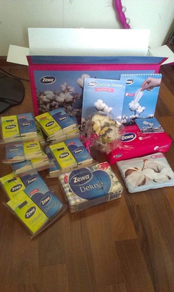 Очень понравились платочки зева, очень мягкие и прочные, приятные н аощупь теперь всегда буду их покупать и больше никакие другие марки. Так же понравились салфетки для лица зева. хорошо очищают лицо, и за набор для всей семьи платочков, вся семья довольнаи всем очень понравился дизайн упаковки помимо качества самих платочков. Косметичка из настоящего хлопка просто прекрасна а так же спасибо за стильный, красивый и оригинальный букетик, марка зева лучшая. Жалко и что не все друзья согласились сфотографироваться, но по возможности еще добавлю фотографий.