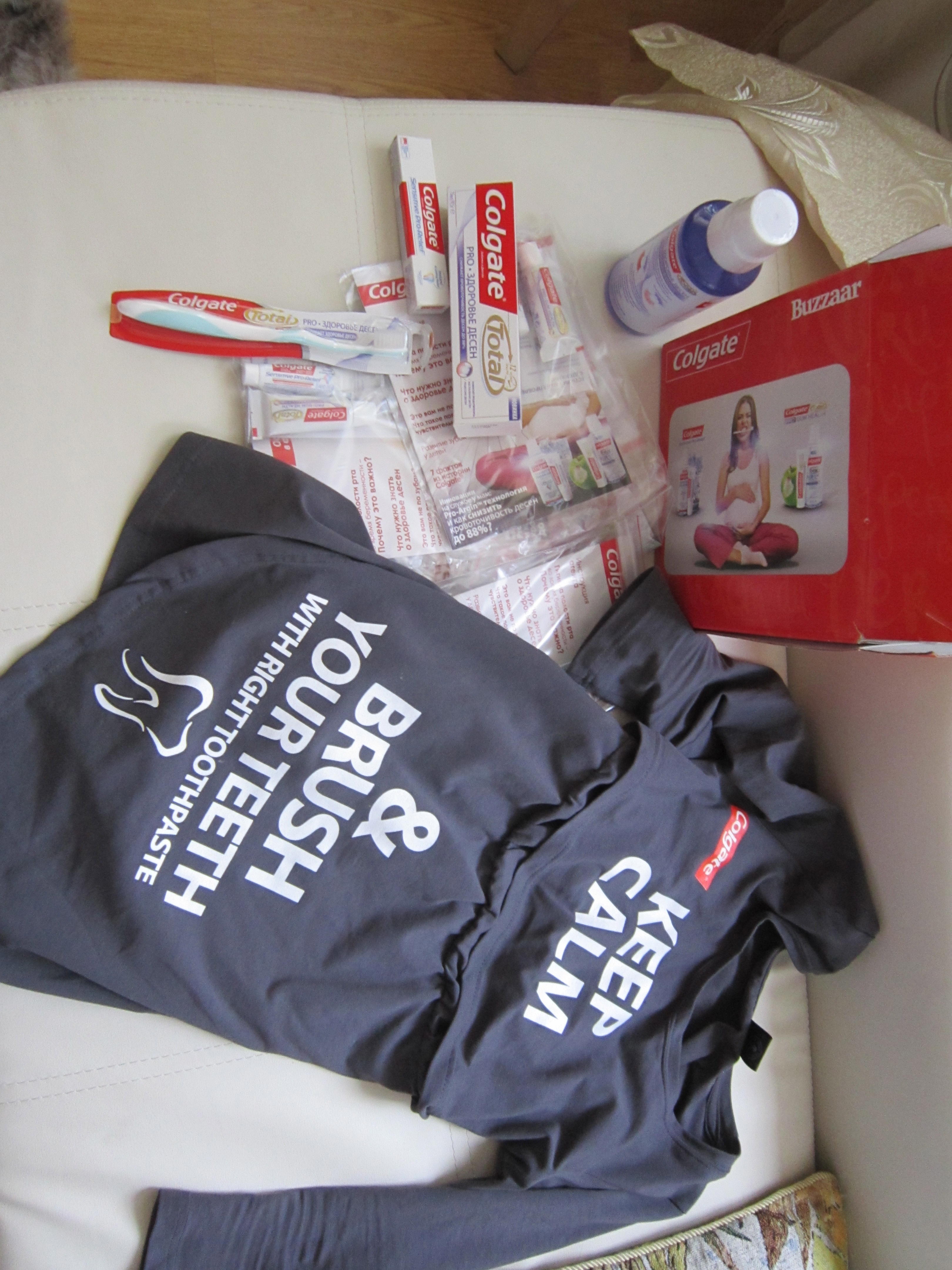 Наконец-то получила коробочку от Сolgate Buzzaar, чему очень рада!! Пришла не только зубная паста, но и ополаскиватель для рта,зубная щетка и .. замечательная футболка с воодушевляющей надписью "Keep Calm"!!! Паста замечательная в меру мягкая и приятная, щеточка с приятной мягкой щетинкой, которая помогает легко и быстро избавиться от остатков пищи в полости рта, и не заменимая вещь ополаскиватель для рта, когда нет времени почистить зубы:))Мамочки это знают:)Спасибо большое организаторам акции за футболку, которая очень необходима для молодых мамочек которые кормят детёныша грудью.